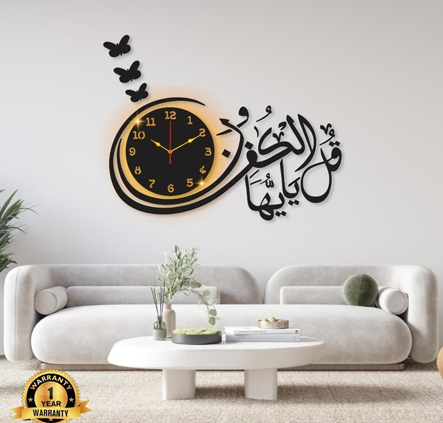 Add a touch of elegance and modern charm to your living room or office with this stunning wall clock. Perfect for Pakistani homes, it blends traditional Islamic calligraphy with contemporary design, making it ideal for both daily use and special occasions. Its sleek black and gold finish adds sophistication without overwhelming your space. Crafted from durable chipboard with a high-quality laminated finish, this clock is built to last. The laser-cut design ensures sharp, clean lines, while the double-sided adhesive tape makes installation effortless. The 12-hour analog display is easy to read, and the stylish calligraphy adds a spiritual and artistic flair. Its 24 x 18 inch size fits most walls beautifully, and the 3mm thickness gives it a premium feel without being bulky. – Premium Quality material ensures long-lasting beauty – Stylish modern design with elegant Arabic calligraphy – Durable laminated finish resists scratches and fading – Easy to hang with included double tape – New Arrival with best price in Pakistan – Perfect for homes, offices, or as a thoughtful gift